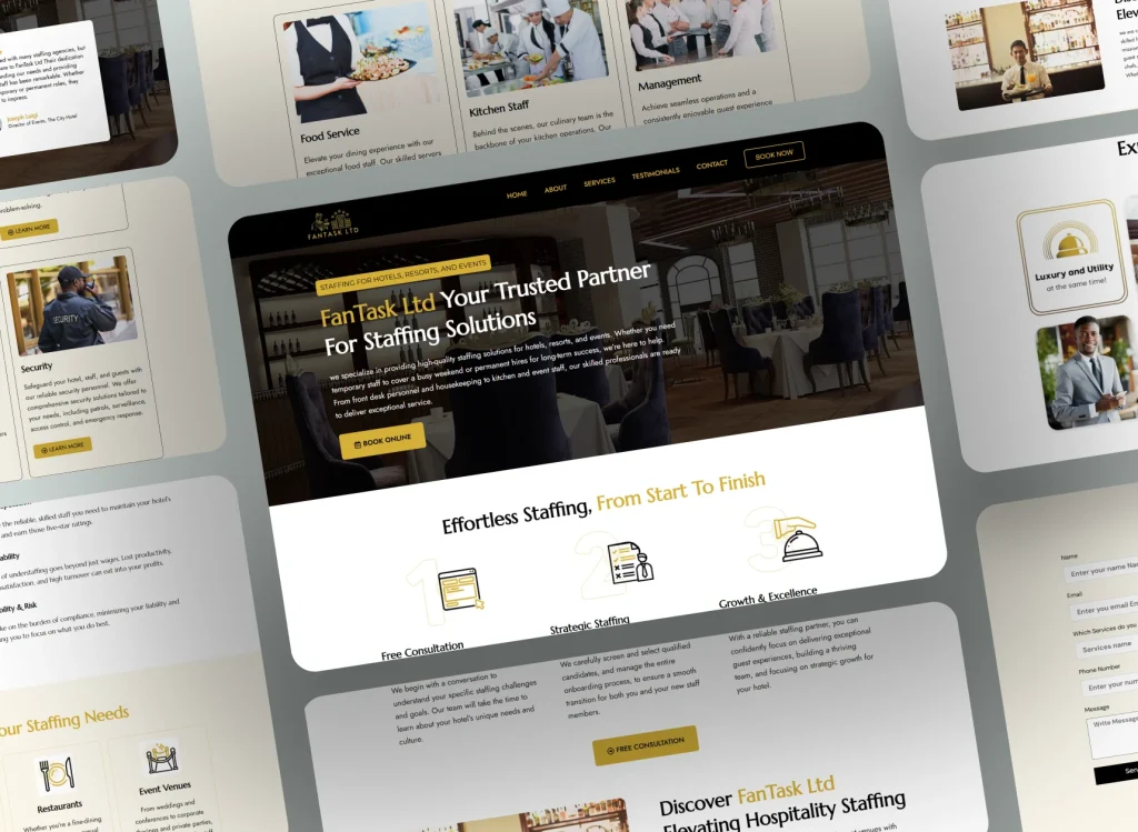 A sleek staffing solutions website helping businesses simplify hiring and elevate hospitality services.